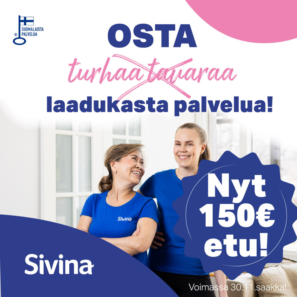 Tilaa marraskuussa säännöllinen kotisiivous ja hyödynnä Sivinan mahtava liittymisetu – saat jopa 150 € alennusta ensimmäiseltä laskultasi!
